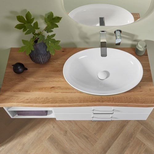 Extra-Slim, Slim-Light, Slim, Massivholz, Classic und Light in unterschiedlicher Optik – modellabhängig mit oder ohne LED, zusätzlich in Bi-Color. Flexible Gestaltung mit breiter oder schmaler vertikaler Platte. Fronten wahlweise mit Griff, mit Griffleiste oder grifflos mit integrierter Technik Push to open. Clevere Details wie ein Wäschebehälter im Schrank, eine Sitztruhe für mehr Komfort und vieles mehr. Maßflexible, offene Regale in nahezu allen Breiten ermöglichen auch in schwierigen Raumsituationen die passgenaue Planung. Verschiedene Keramik-Becken oder edle Glas-Waschbecken wählbar. Imposante Auswahl an Größen, Formen, Materialien und Farben für jeden Einrichtungsstil
